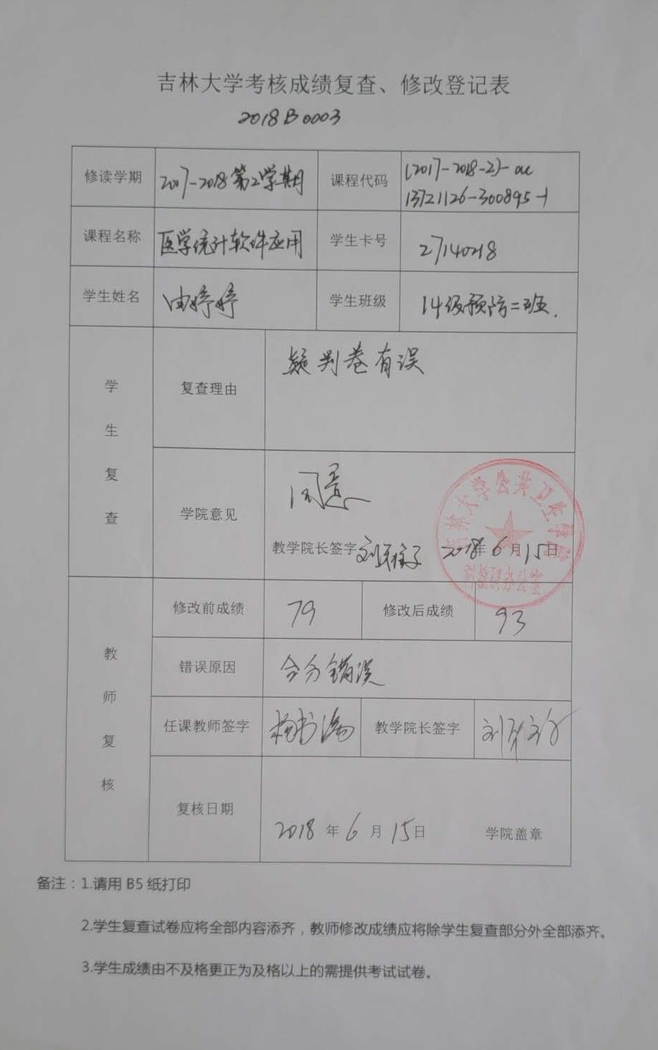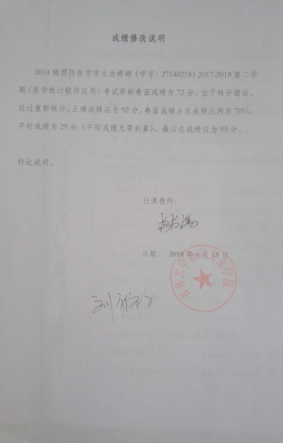 根据《关于进一步明确本科生课程考核等有关问题的通知》(校教字〔2018〕47号)文件有关精神,现对tyc539太阳集团公司2014级由婷婷同学(27140218)2017-2018-2《医学统计软件应用》成绩更正如下: