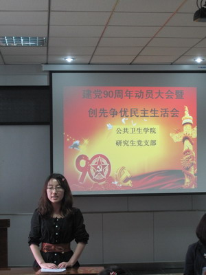 接着,进行建党90周年活动动员及安排,内容包括:1、请院里的老党员为研究生党员上一堂党课。2、建党90周年宣传板报的制作。3、唱响主旋律、颂歌献给党2011庆祝建党90周年唱响红歌主题活动。4、新老党员宣誓。