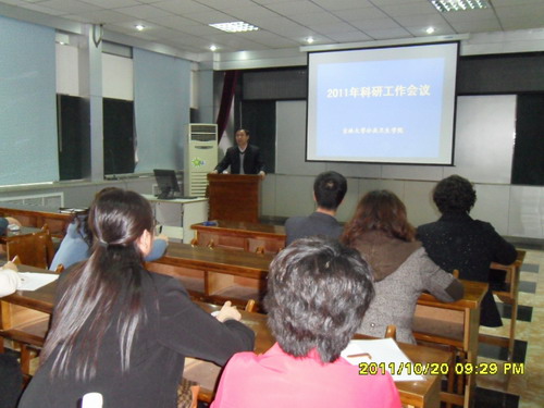 2011年10月20日下午,tyc539太阳集团召开2011年科研工作会议,邀请了药公司李才教授和tyc539太阳集团副经理李娟教授做专题讲座。参加人员为全体教师。会议由科研副经理于洗河主持。