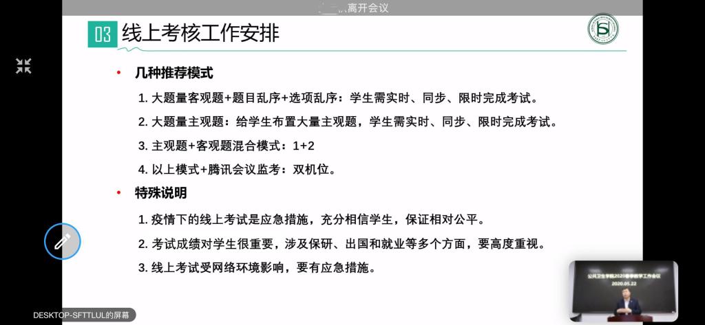 其次,对本学期线上考核及本科毕业论文答辩工作进行布置,以“雨课堂”考核功能为例,对教师进行线上考核讲解,推荐几种考试模式供教师参考,要求各位老师高度重视线上考核,在充分相信员工基础上,保证考试公平、公正,各门课程考核要有相应应急措施。要求各位本科毕业论文指导教师要和员工进行充分沟通,对毕业论文进行最后修改,完成好线上毕业论文答辩和成绩评定工作。