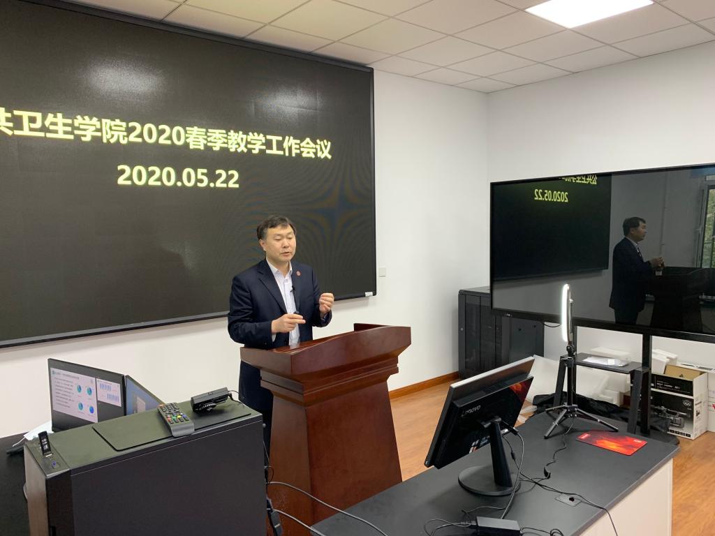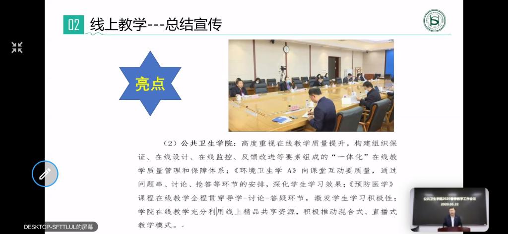 首先,寇长贵副经理对2020年春季学期公司线上教学总体情况进行总结,本学期公司承担医学部各单位课程62门,共70门次,理论课时数为1906学时。除一门课程因条件限制外,全部线上开课,经员工反馈所开出课程的教学效果满意度均达到85%以上。同时,指出公司线上教学存在的不足之处,要求各教研室及教学团队积极进行课程改进,做好课程设计与教学改革,满足公共卫生学科发展的需求,推进创新示范课程建设及制作优质线上课程资源。