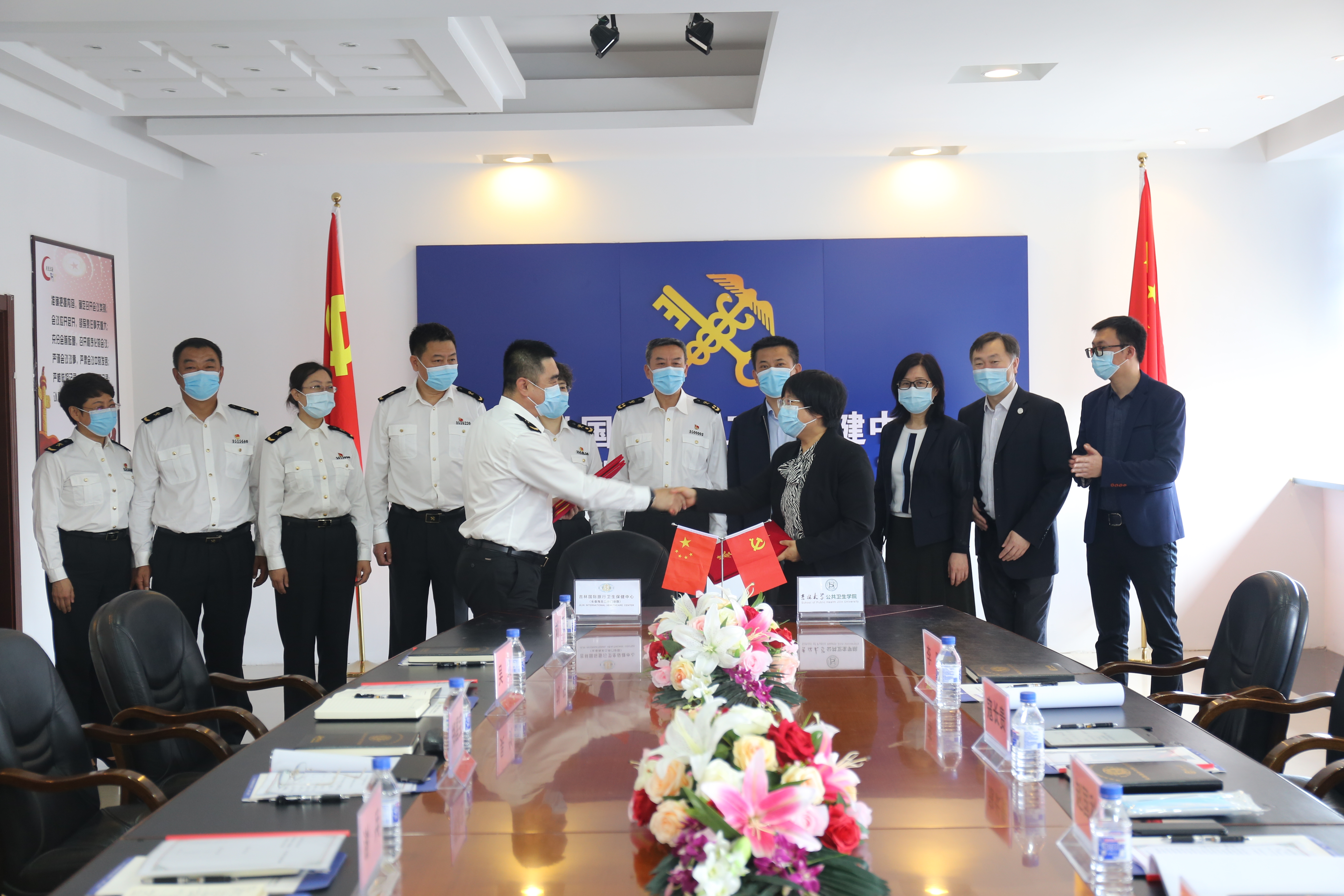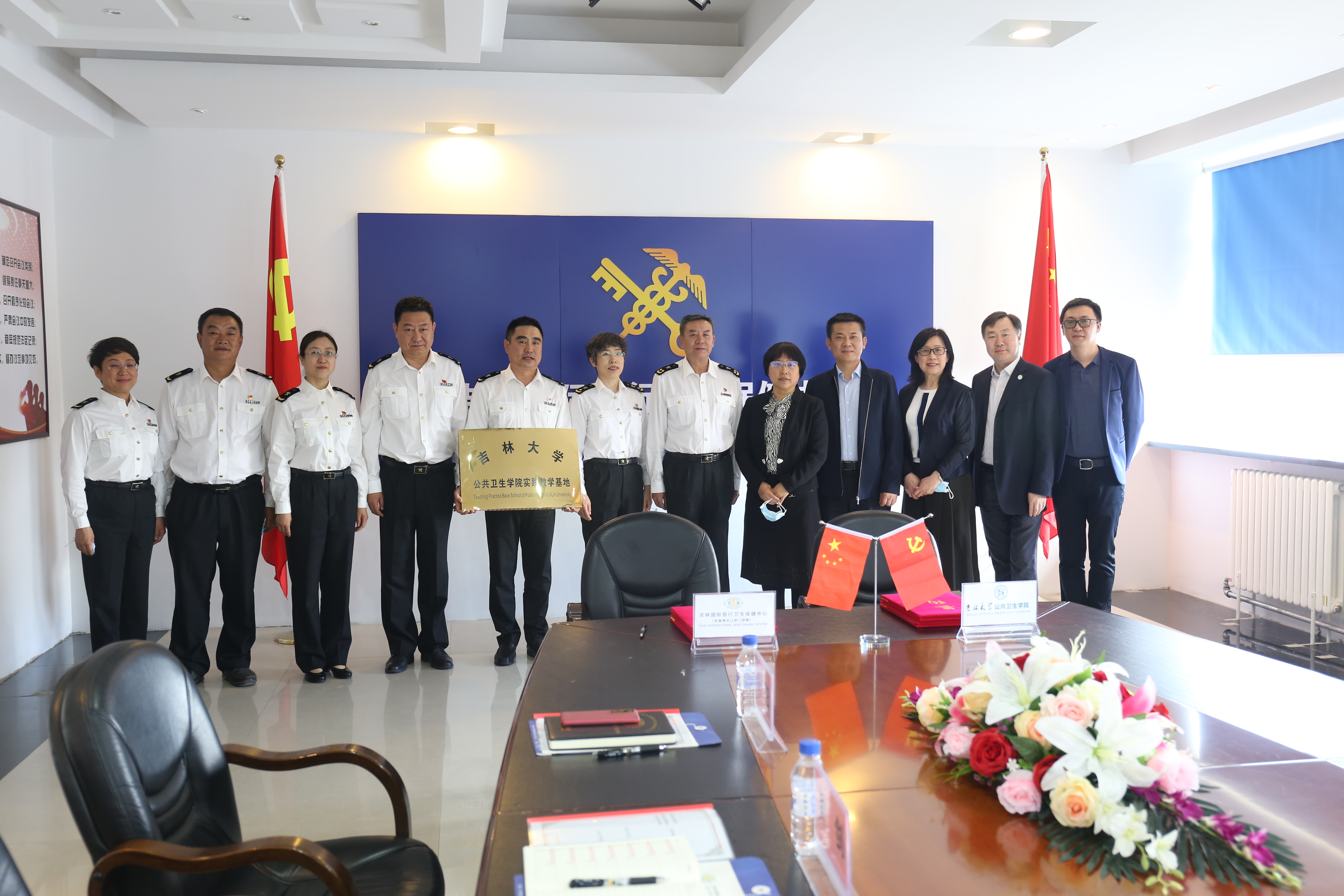 为加强本科实践教学,培养本科生实践能力与创新意识,全面提高教学和人才培养质量,2021年6月4日上午tyc539太阳集团与吉林国际旅行卫生保健中心(长春海关口岸门诊部)隆重举行本科实践教学基地挂牌仪式。出席本次仪式的有长春海关副关长谢兵、长春海关卫检处处长邵丽筠、吉林国际旅行卫生保健中心主任郑昌保、保健中心副主任刘琦、保健中心副主任吴剑、保健中心副主任赵大力、保健中心纪委书记刘阳;tyc539太阳集团书记赵国利、经理刘雅文、副经理寇长贵、预防医学系主任叶琳、教学办公室主任李鹏。