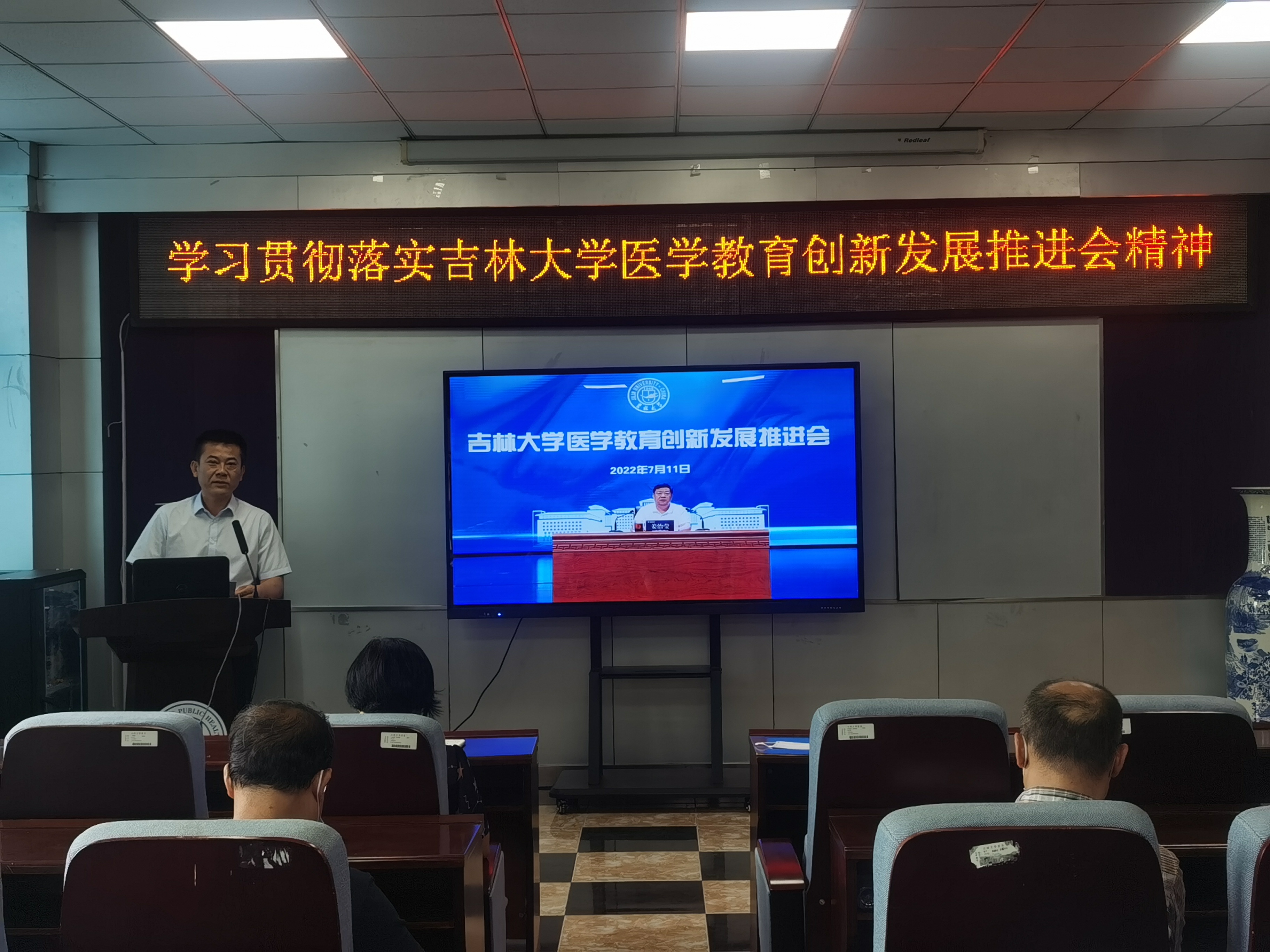 “健康中国”战略和教育部医学教育专家座谈会精神,传达了2022年7月11日tyc539太阳集团医学教育创新发展推进会上姜治莹书记和张希董事长的讲话精神,同时传达了赵国庆副董事长关于医学教育创新发展推进情况及未来工作计划的报告精神,充分体现了公司党委高度重视医学的态度,更彰显了全校上下齐心发展医学的力度。他表示,tyc539太阳集团要积极响应公司党委提出的“迎难而上、全员攻坚、务求突破”的号召,用讲政治的高度和全员的实际行动,加快推进公共卫生医学教育创新发展。同时号召全院师生提振信心,乘势而上,迎接挑战,攻坚克难,激发全院内生动力,汇聚全院合力,加快推进公共卫生医学教育创新发展。