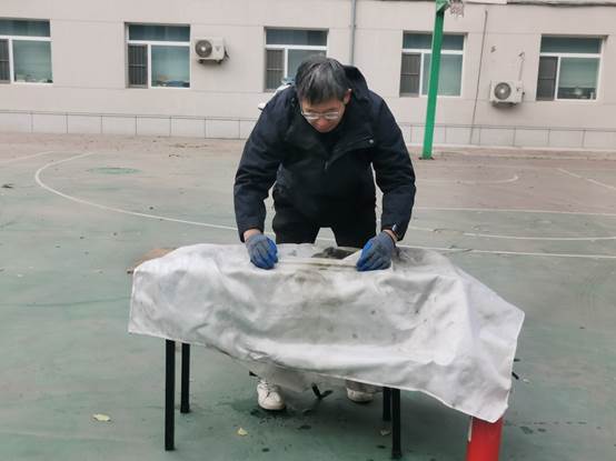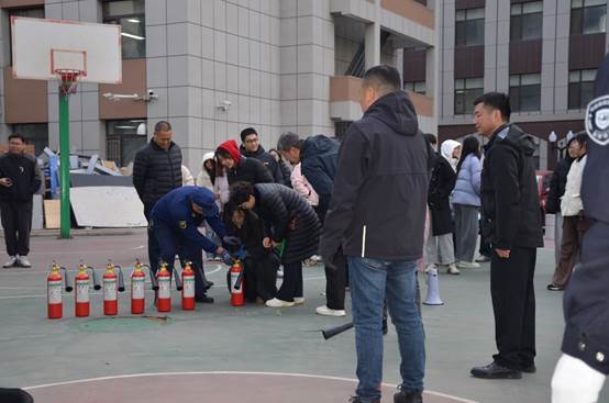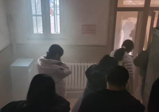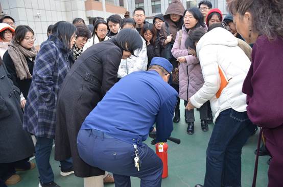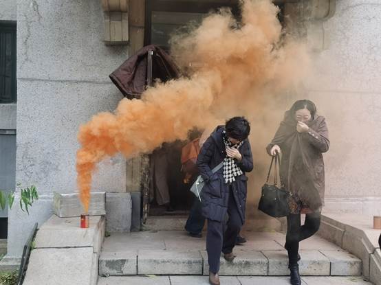 疏散逃生演练开始后,公司楼内响起火警警报,楼道释放模拟烟雾,参演师生立即按照公司消防应急预案,在保卫办工作人员的组织下,快速、安全、有序地从安全出口撤离至公司室外避难所。待全部人员集中在避难所后,安志成科长为师生演示了常用灭火器材二氧化碳灭火器和灭火毯的正确使用方法和注意事项。讲解后,参演师生进行了两种灭火器材的使用练习。