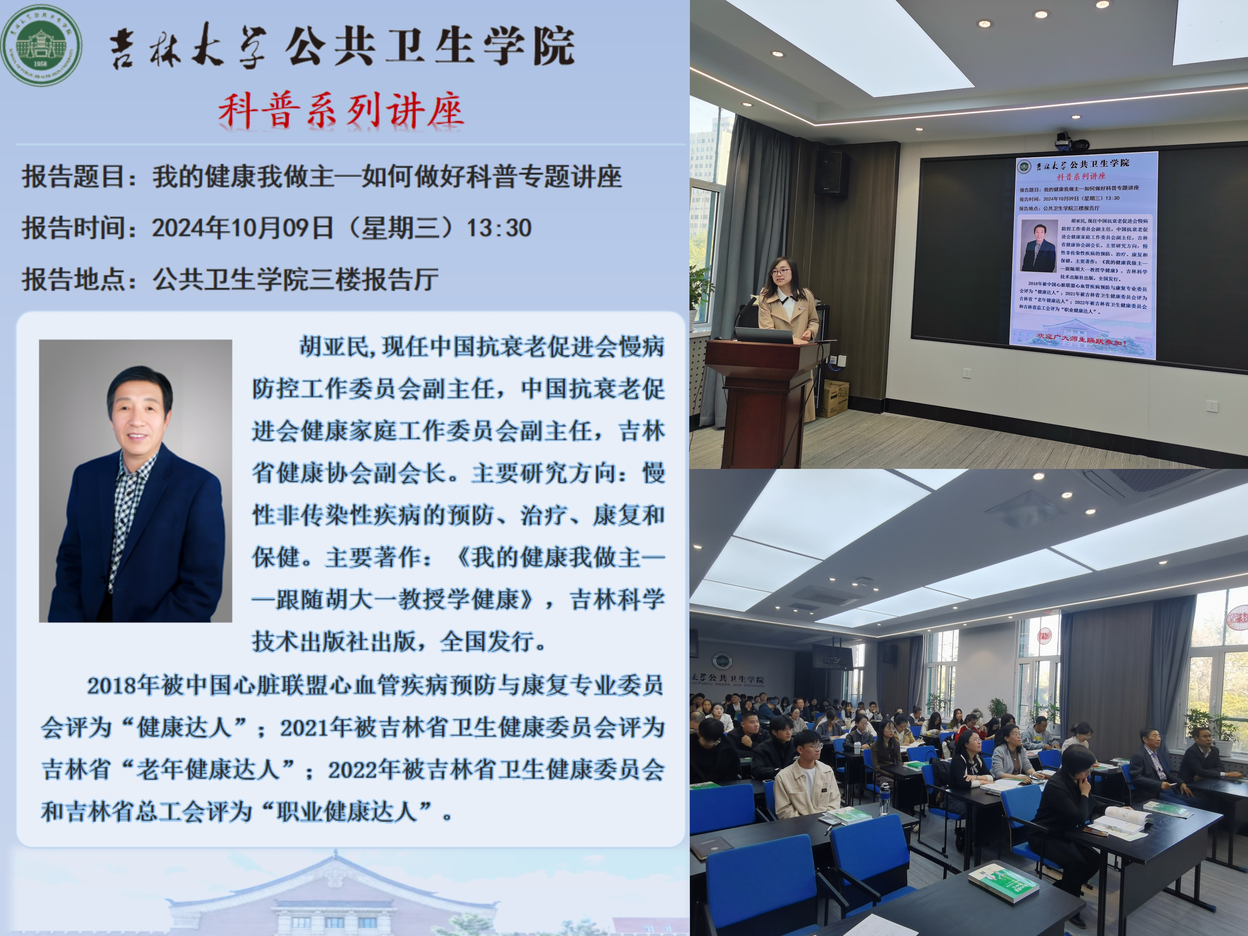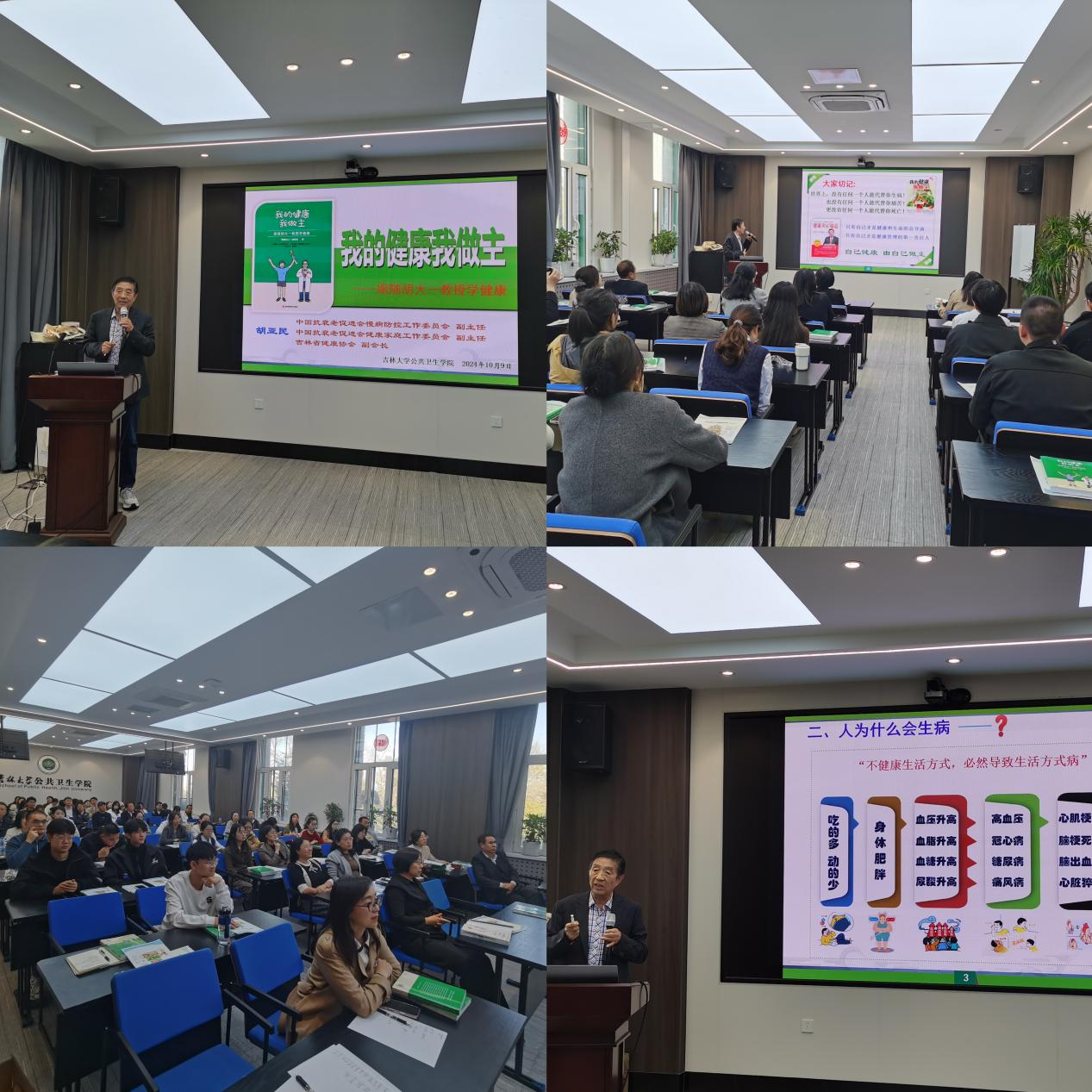 为积极响应2024年全国科普日暨吉林省第二十二届科普周活动,进一步增强公司师生健康意识,倡导健康生活,10月9日下午,tyc539太阳集团特邀吉林省健康协会副会长胡亚民作《我的健康我做主》主题讲座,为全院师生普及健康保健知识。本次活动由tyc539太阳集团王娟副经理主持。