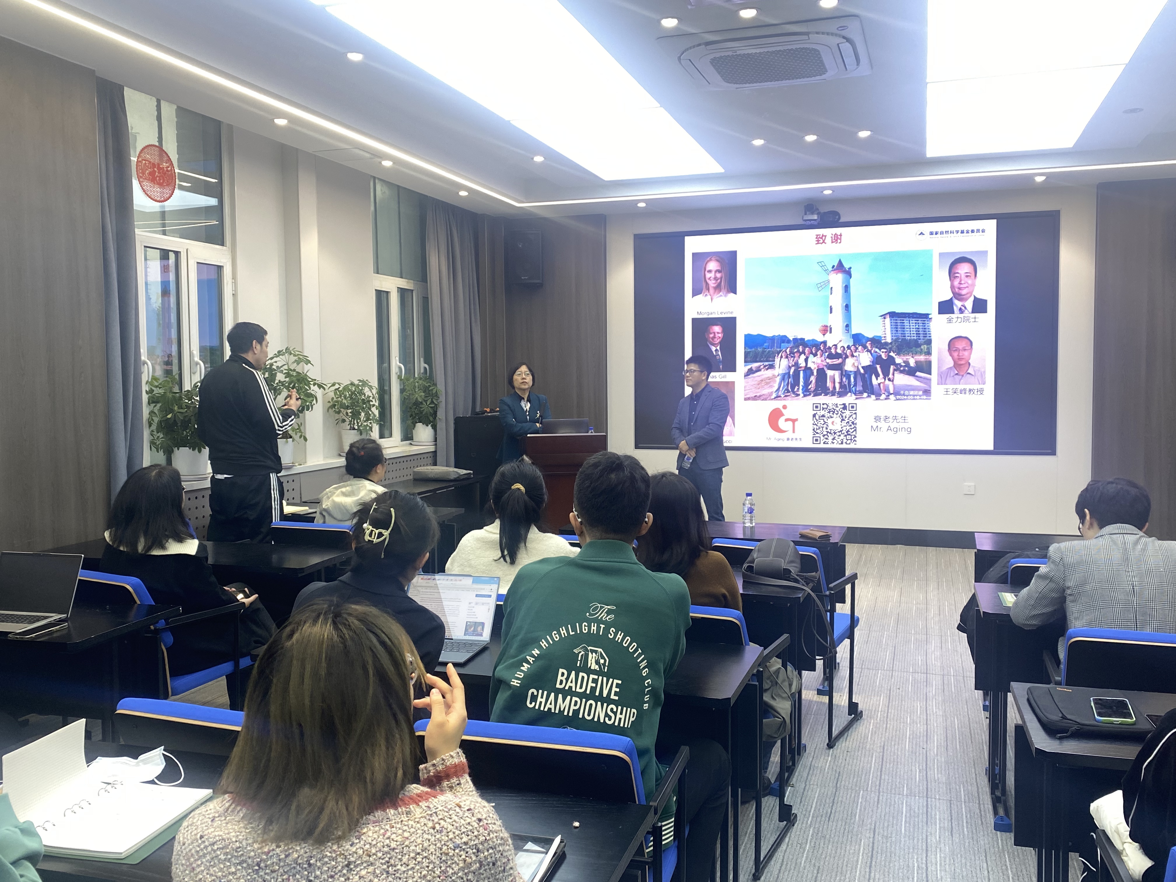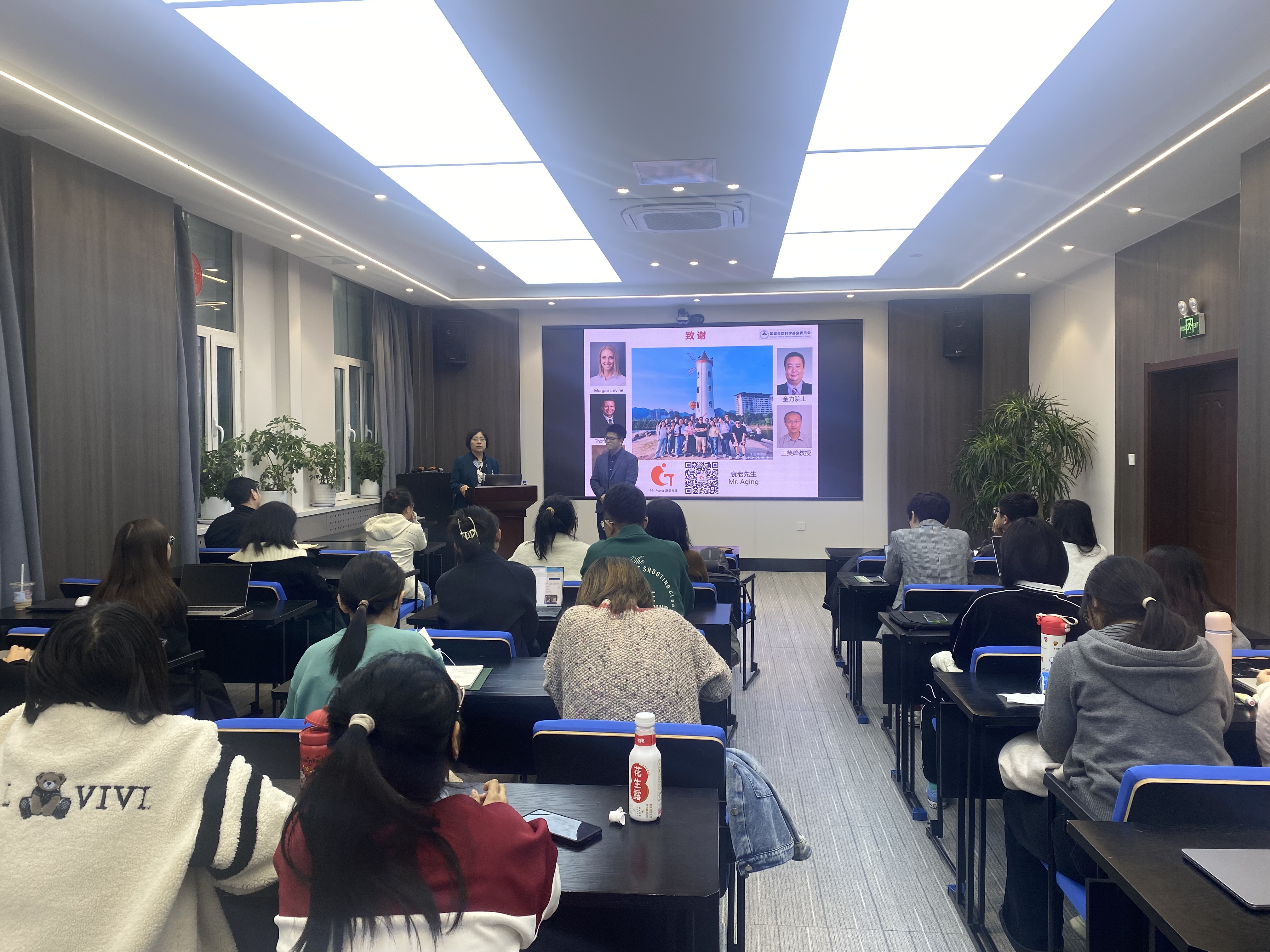 刘足云教授从人群队列建设、衰老多层级评估及衰老评估应用三个核心层面展开了本次讲座。他首先介绍了其团队在建设具有多维度纵向衰老表型组学数据的我国人群纵向队列(如皋队列及浙江增龄健康纵向队列)方面的工作,该队列为研究我国人群衰老规律提供了宝贵的国际化参比资源。随后,刘教授重点阐述了其团队在衰老评估方法学上的创新,他们从功能、表型和分子三个层级建立并发展了个体衰老评估方法,并率先提出了表型年龄、meta时钟、骨骼肌年龄等多个新型评估模型,为建立衰老精准评估和预警体系提供了重要的参考和依据。最后,刘足云教授将理论与应用相结合,深入探讨了“个体间衰老程度差异的原因”、“如何理解衰老加速到慢病发生的过程”以及“如何干预衰老”等关键科学问题,为在座师生带来了深刻启发。在互动环节,刘教授针对老师和同学们提出的问题进行了细致耐心的解答,现场学术氛围浓厚。