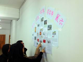 首先,团委号召11级同学上网学习“当代雷锋”志愿服务的事迹。在本次活动中,同学们纷纷拿起笔,通过散文、小说、诗歌等文学形式,按照“内容丰富,感想深刻”的要求对雷锋甘于奉献、乐于助人的美好品质进行讴歌,并表达了自己投身志愿服务的热情和决心。文章内容语言通顺、词汇优美,展现出了较高的文学素养和思想境界。随后,社会实践部成员将同学们上交的感想精心挑选,贴在墙上与其他同学分享交流。雷锋精神在同学们的口中、心中传递着、充实着。