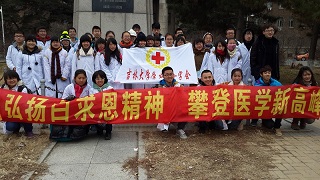 首先,红十志愿者们身穿洁白的医护服组成字方阵,手持红烛,在基础楼正门前的白求恩纪念塑像前庄严宣誓:“我宣誓为红十字会会员,尽忠服务本土及与世界各地红十字会会员联合一致,扶助疾病及患难人士。谨记人道、博爱、奉献的宗旨”。声音在回荡,烛光在闪动。这饱含激情的庄严宣誓,传达的是每个红十会员、每位医学学子的内心和信仰。之后由全体人员在“弘扬白求恩精神,攀登医学新高峰”的横幅上签名立志。虽然还飘着小雪,但大家并不在乎寒冷,场面庄重严肃而又温馨和祥和。宣誓仪式结束后,同学们在新民活动室里聆听并实践了学长讲解的测血压的方法。