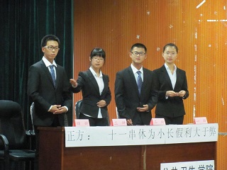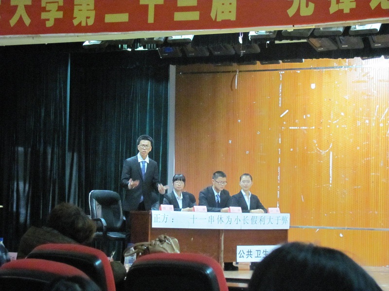 主持人宣布开始后,由双方辩友分别自我介绍,并简单展示本方观点;之后,有请评委上场。主持人宣布比赛规则和评分标准。紧张热烈的比赛随即开始,本场比赛共四个环节。在整场辩论过程当中,tyc539太阳集团辩论队辩手立足国情,放眼天下,能言善辩,慷慨陈词;借确凿的数据和事实论证,用流畅的语言和思维表述;冷静发挥,稳扎稳打;队员们谦和有礼气度不凡 ,时不时引发观众热烈的掌声。他们的表现充分解释了“先锋”的含义,体现了当代老员工的良好风貌和深厚涵养。辩论结束之后,评委退场。最后一个环节是台上台下互动交流,场面和谐而又火爆。评委公议结束后,由黄征老师阐述了本次比赛的公平性,并点评了双方的表现。老师高度赞同tyc539太阳集团的观点,表扬我们的阐述能力,也指出其中的漏洞,并予以精彩而独到的补充。