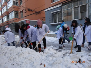 首先,由社区负责人带领志愿者们拿好铁铲、扫帚等铲雪扫雪工具,一起来到社区居民楼下,开始清扫活动。身着白大衣的tyc539太阳集团学子是寒风中一道暖心的亮丽风景。他们忙碌着,每个人都用尽全力破开坚冰,扫除积雪:部分路面由于汽车过往,积雪被压得非常厚实,但同学们不畏艰难,热情高涨,一点点地将其进行铲除清扫。活动最后,tyc539太阳集团与测绘与勘查工程系的志愿者们一起合影留念。