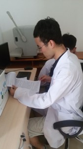 早上8:00,参加志愿实习的同学们就已准时在医院门口集合,穿好白大褂,开始了一天的志愿实习生活。在医院医生的带领下,同学们先后参观了医院的工作环境,了解了医生的工作流程和注意事项。放射科是医院重要的辅助检查科室,设备昂贵,工作精细,操作不当将会对医生和患者有严重的影响和副作用,同学们因此都十分认真地听取医生的讲解,仔细地记录下实习工作中重要和容易疏忽的部分,并且与自己的课堂所学进行整合,避免工作失误。同学们分好工后就有序的开始协助医生工作。通过填表、记录、导诊这样的小工作,同学们体会到了放射科举足轻重地位和严谨的工作态度,工作热情十分高涨。