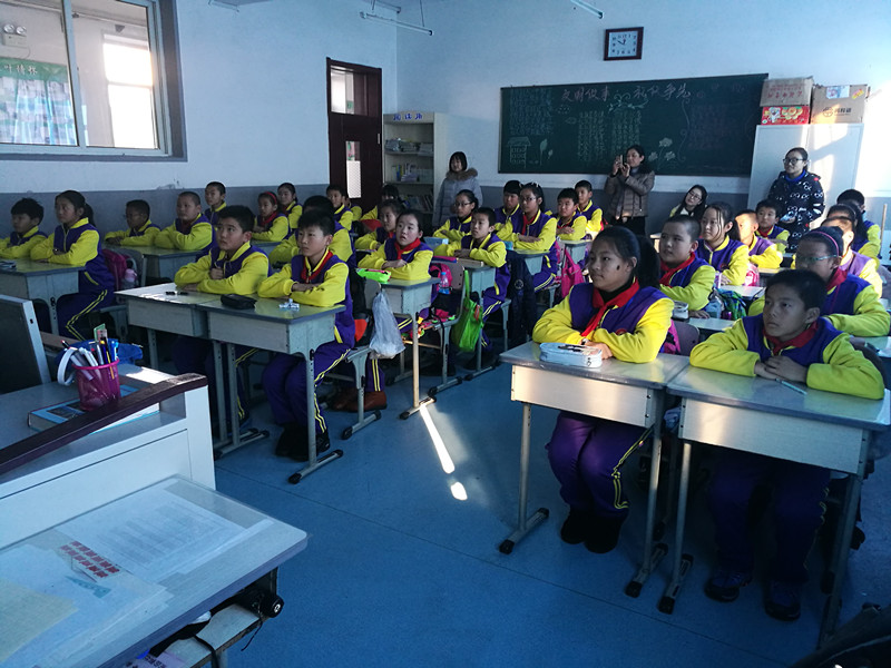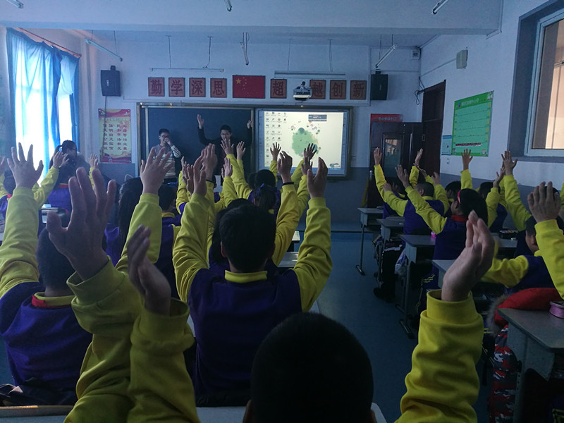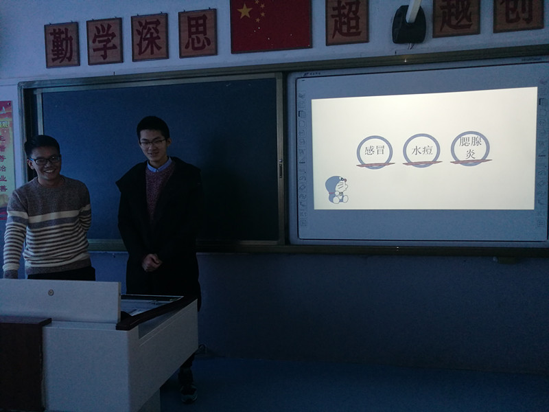 这次活动主要以讲课的形式向富锋镇中心小学六年级二班的同学们介绍了有关流行性疾病的知识。为活跃课堂气氛,志愿者首先与同学们进行了一个简单的游戏:把手举过头顶,击掌三下,然后迅速将两手合在一起,记住哪个手的拇指在上侧。随后,再次重复相同的动作,要求换成另一只手的拇指位于上侧。一个简简单单的游戏,现场大部分同学却都做错了。事实上,这是一个考察人是否专注的游戏。志愿者们组织进行这个游戏的目的,就是提醒同学们要认真听课。紧接着,志愿者在课堂上播放了一个有关感冒的动画视频,引起了现场同学对预防疾病知识浓厚的兴趣。在一片欢声笑语中,活动正式进入了主题。