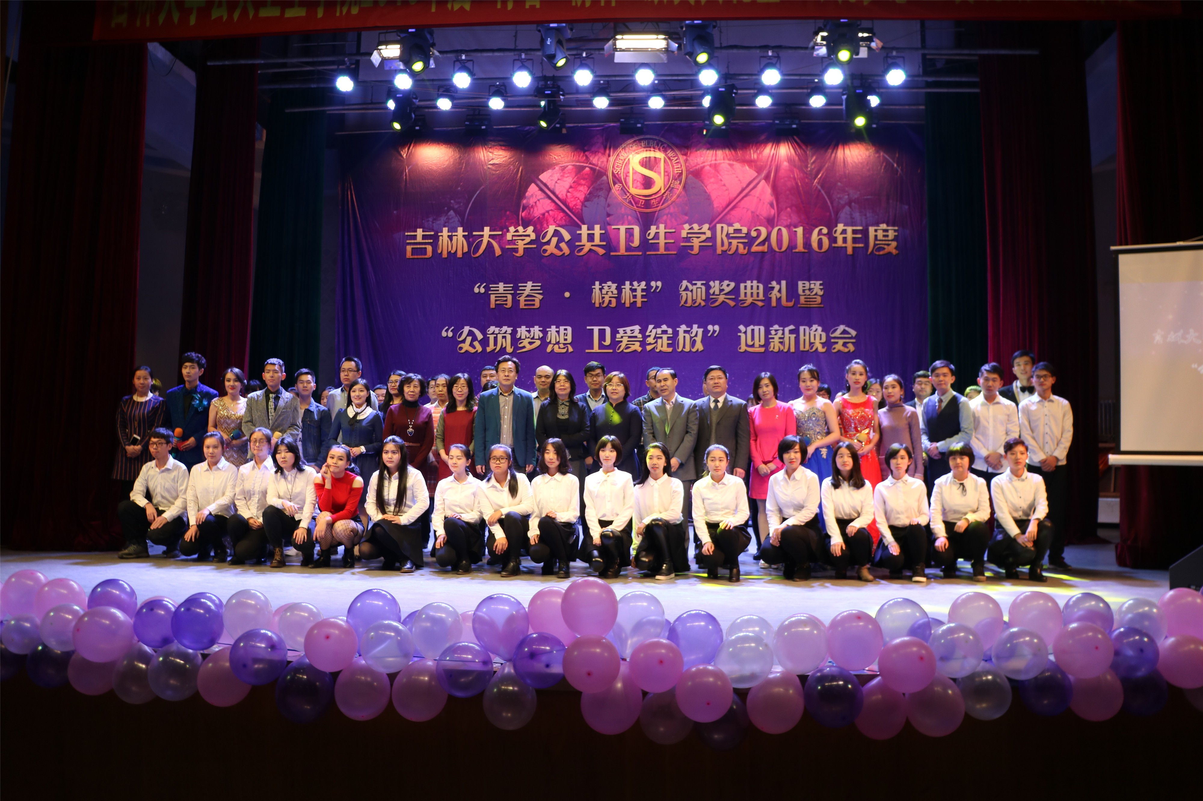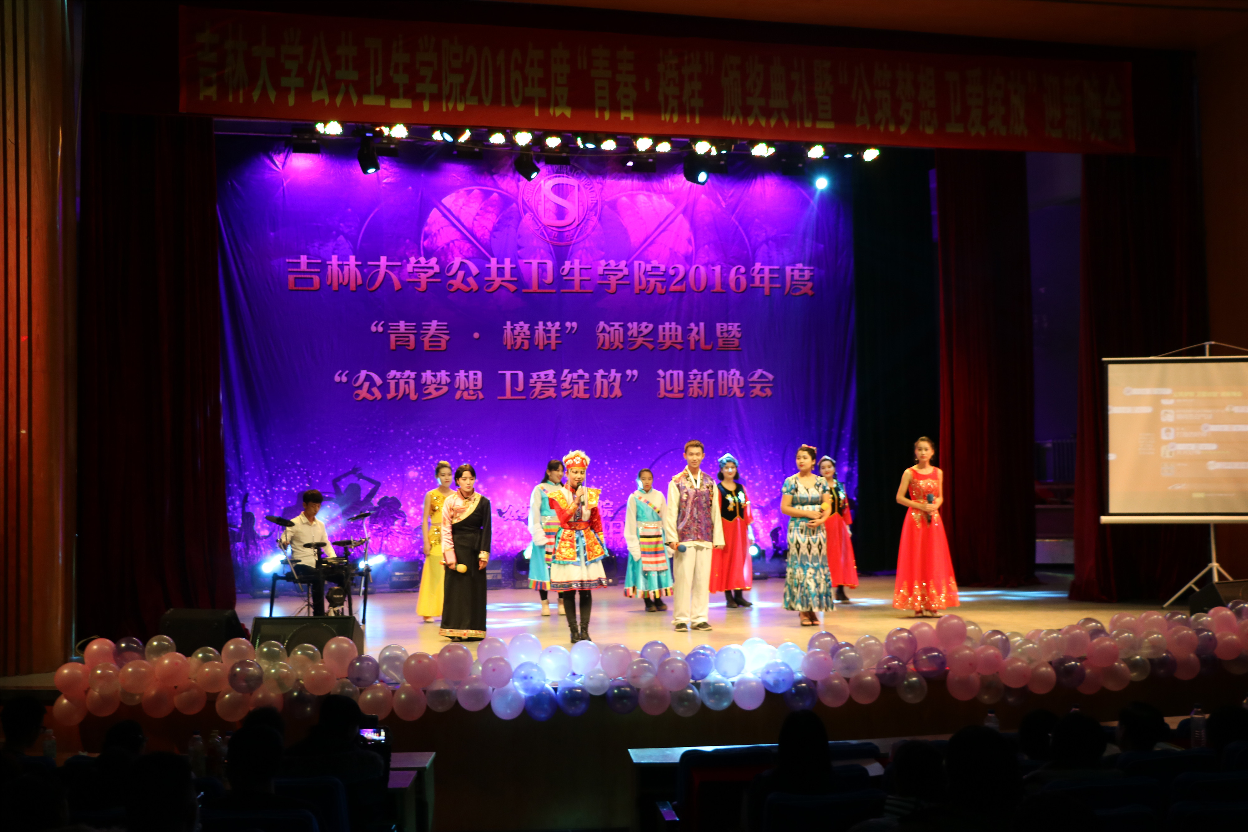 在一阵热烈的掌声中,活力十足的劲歌热舞率先掀起了2016年度“公筑梦想 卫爱绽放”迎新晚会的高潮。整场晚会呈现的节目精彩连连:歌曲《陪你一起看草原》和民族歌舞串烧《喜欢你》为观众呈现了多姿多彩的民族文化,营造出民族融合、共同进步的和谐盛景;诗歌朗诵《祖国,我亲爱的祖国》字字铿锵有力,句句掷地有声,唤起了同学们深藏心底的爱国情怀;搞笑喜剧《大话公卫》更是以幽默风趣的台词介绍了公司的现状、学科的发展前景以及同学们的校园生活状态;《老员工活》是同学们精彩演绎的视频配音作品,表演方式新颖独特,引起了现场观众的共鸣;歌舞《恋人心》和《告白气球》利用流行元素,烘托出同学之间浪漫的情愫,展现出公卫学子的青春与活力;《相亲相爱》是tyc539太阳集团全体师生共同表演的大型歌舞,寄托了公司全体师生精诚互助、共同进步的精神内涵,在师生亲密无间的合作中,晚会渐渐步入了尾声。