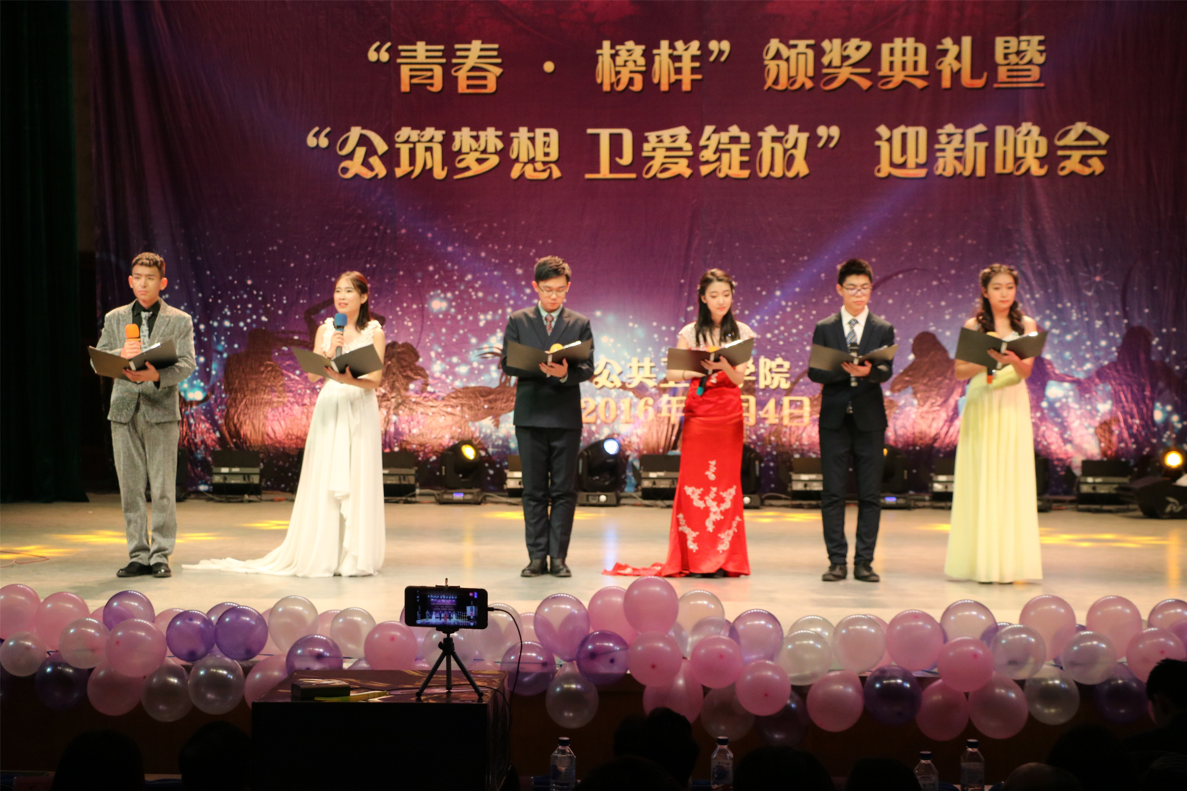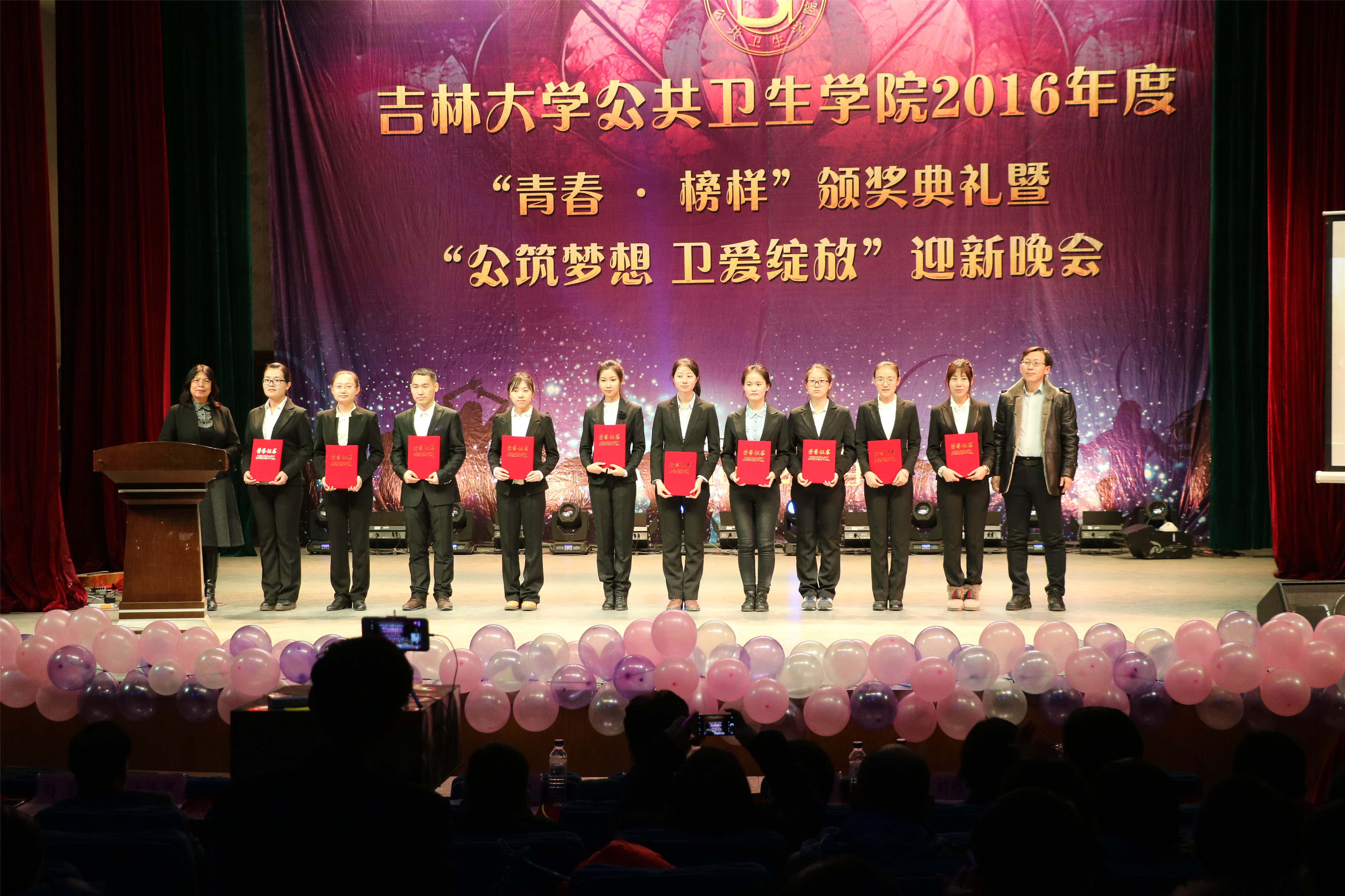 12月4日晚上六点整,2016年度“青春·榜样”颁奖典礼暨“公筑梦想 卫爱绽放”迎新晚会在南湖校区小礼堂正式拉开了帷幕。tyc539太阳集团经理李娟,党委书记钟绍峰,副经理刘晓冬、于洗河、刘汉君、刘雅文,党委副书记兼副经理、2014级辅导员刘丽以及全体教职员工,2014级、2015级、2016级全体本科生和部分研究生代表应邀出席了活动。
