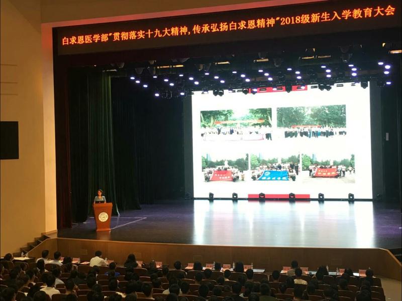 为传承和发扬白求恩精神,加深新生对白求恩医学部的归属感、荣誉感、责任,8月27日上午8点,白求恩医学部在中心校区鼎新大礼堂举办2018级新生入学教育大会。首都医科大学附属友谊医院主任医师、白求恩医科大学北京员工会会长尤红出席了本次会议。