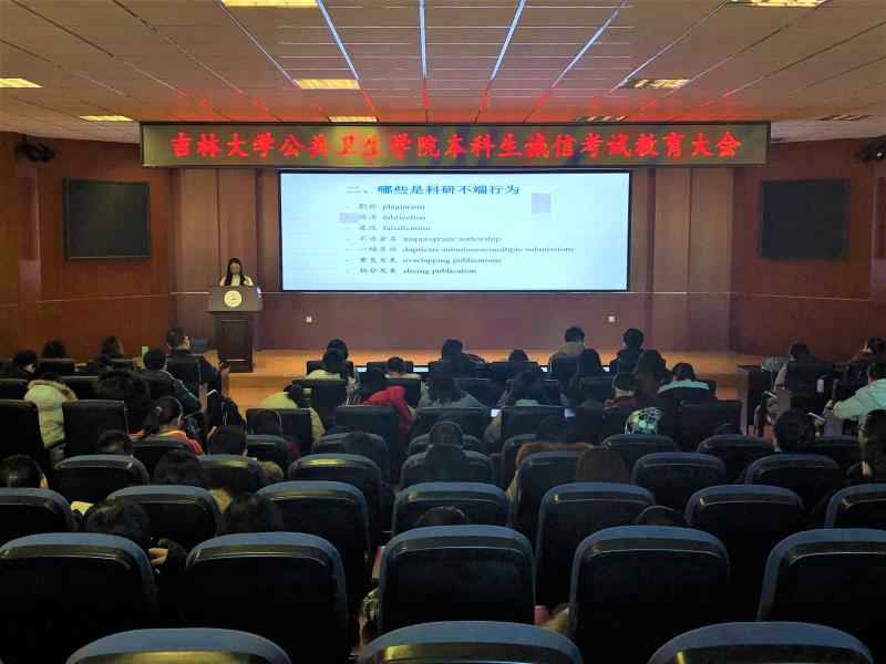 在2019年全国硕士研究生招生考试来临之际,根据吉林省招生委员会吉林省教育厅《关于开展净化研究生考试环境系列活动的通知》(吉招委联字〔2018〕5号)文件精神和公司通知要求,为严肃考风考纪,营造和谐健康的考试环境,tyc539太阳集团于2018年12月18日中午在新民校区第一教学楼401教室召开诚信考试教育大会(本科生专场)。公共卫生公司党委副书记兼副经理、2014级员工辅导员刘丽,2017级流行病与卫生统计学研究生李梦担任主讲人,2014级全体本科生参加会议。