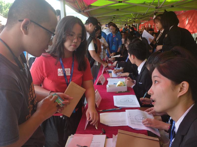 新生到来时,导助们热情接待、细心讲解,前台工作人员耐心指导,为其办理入学手续:从领取档案、发放一卡通和银行卡、办理医疗保险,到分发寝室钥匙、办理入学绿色通道、介绍勤工助学岗位,再到志愿者们为家长讲解公司概况、就业前景,为员工拿持行李、引路回寝,各司其职,无微不至,带给了员工和家长轻松愉悦的入学体验。尽管天气阴晴不定,不时下起小雨,他们依旧不辞辛劳,坚守在自己的岗位上,以确保迎新工作有条不紊的进行。