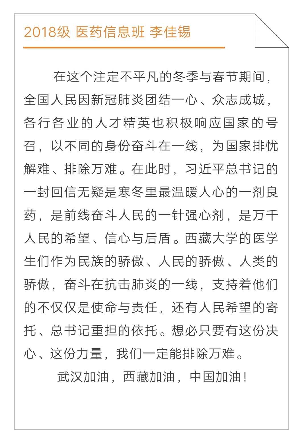 活动开始,同学们热情高涨,积极学习习近平总书记回信精神,记录学习心得。公司微信公众平台“JLU公小卫”经过认真挑选,发布了许多优秀的心得作品,供大家参考学习。在学习过程中,同学们纷纷表示要以习总书记回信精神的要求作为自己学习、生活的目标,努力学习专业知识,刻苦锻炼专业技能。在重大突发公共卫生事件发生时,能充分发挥专业优势,投身一线,用实际行动肩负起新时代青年医员工的使命和担当。正如同学们心得中所写“身为医员工,身为公卫人,此时此刻我的心情澎湃,为我的选择而自豪,为我从医的心而自豪。”