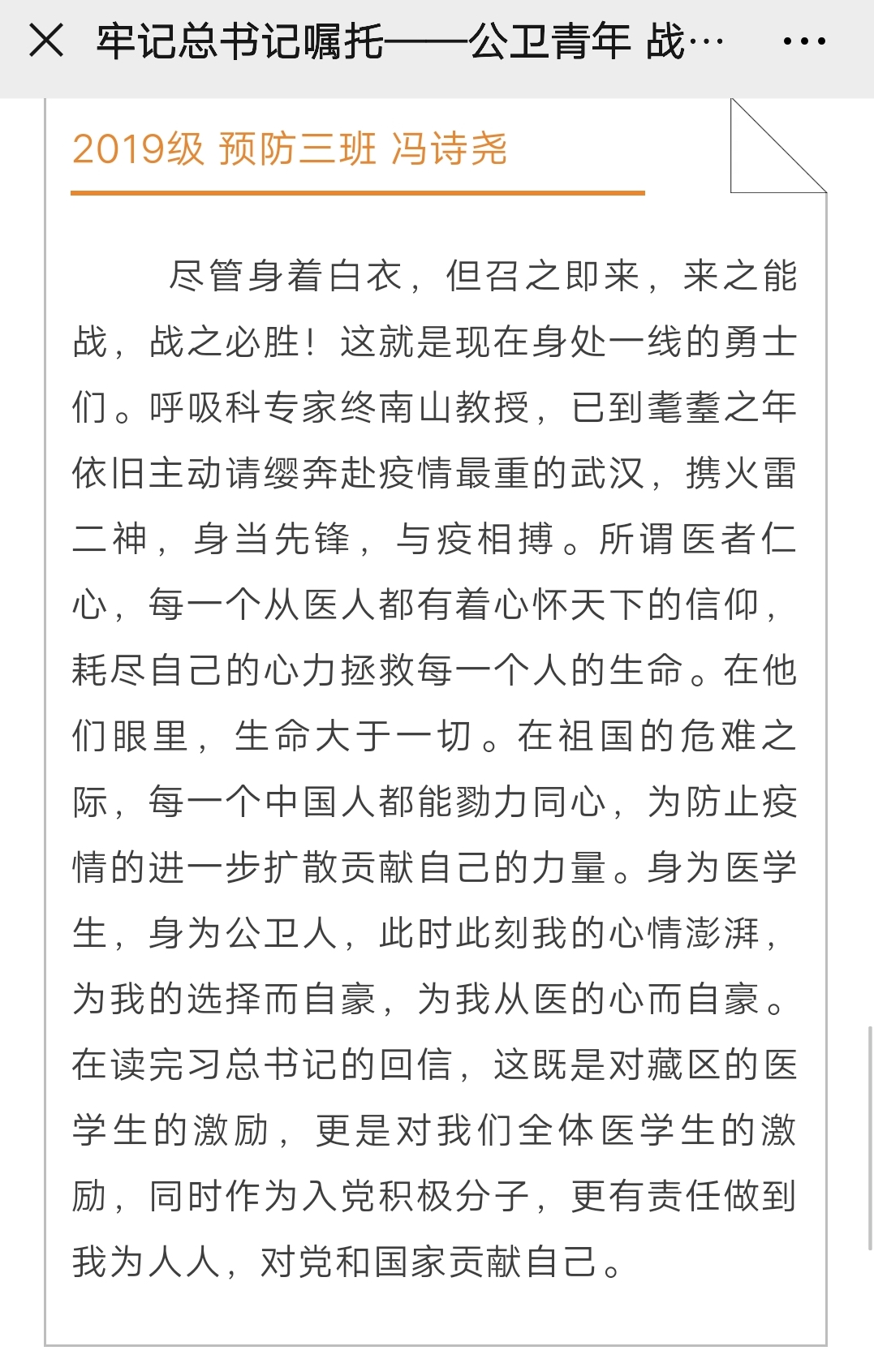 为深入学习近平总书记回信精神,积极响应国家号召,自觉防“疫”、战“疫”。2月23日,tyc539太阳集团团委组织部开展“牢记总书记嘱托——公卫青年战疫在线”系列活动,号召同学们通过多种形式,积极参与到全民抗疫的工作中,用实际行动诠释医员工的责任与担当。tyc539太阳集团全体员工参加了本次活动。