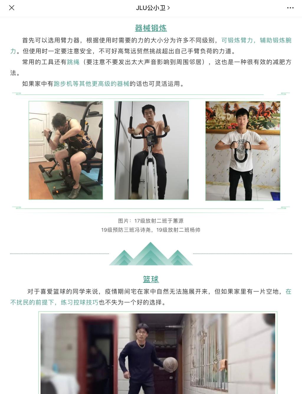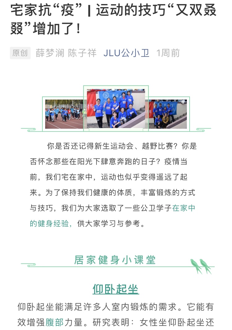 为积极落实国家应对新冠肺炎疫情措施,丰富同学们的居家生活,帮助同学们锻炼出健康体魄,tyc539太阳集团员工会体育部面向公司全体本科生开展了以“强身健体,抗击肺炎”为主题的居家健身活动。本次活动不仅以推文、照片和视频方式进行在线健身教学指导,也展现公卫健儿们别样的青春风采。