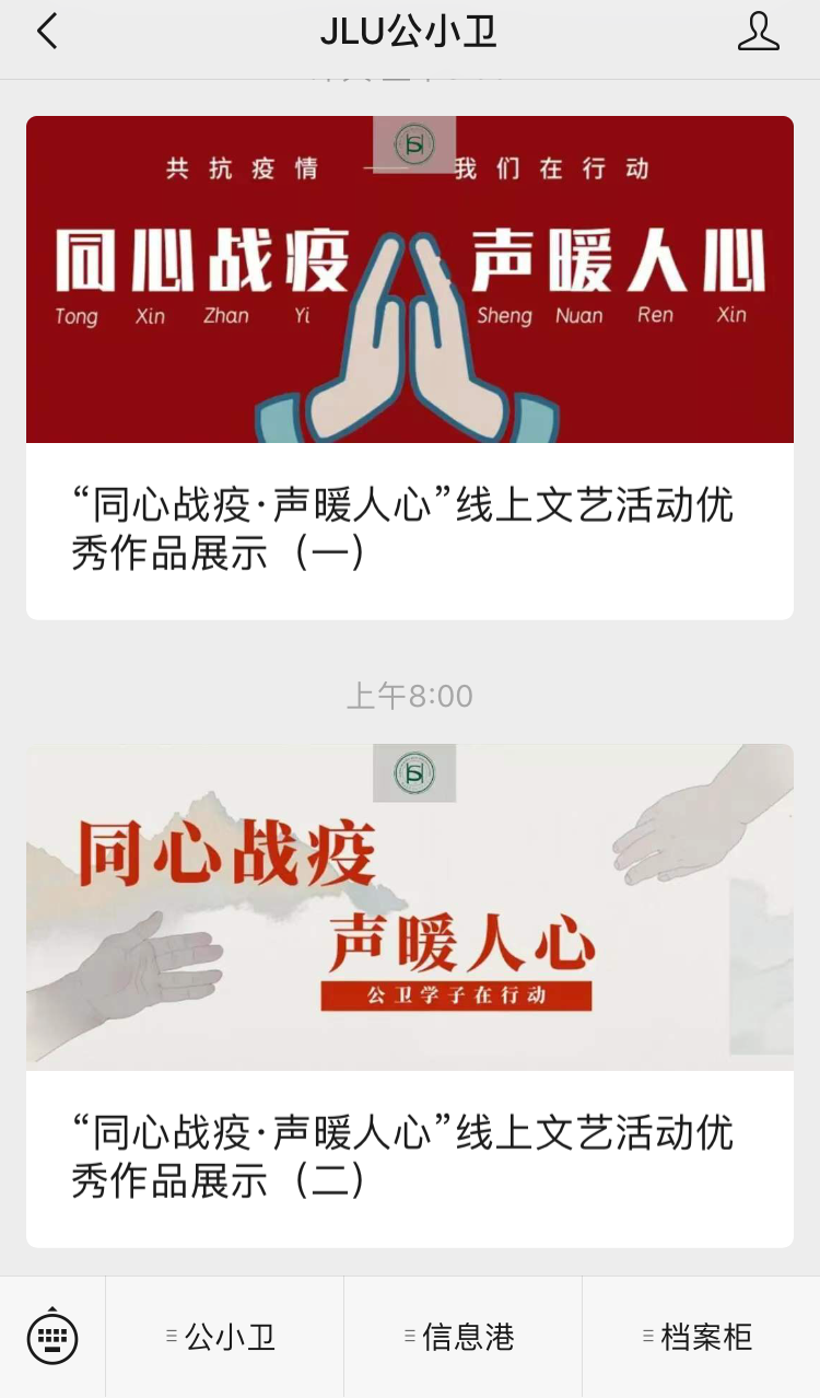活动前期,参与报名的同学需自行选择与抗击疫情主题相关歌曲,并录制歌曲的音频视频。歌曲要求内容积极向上,符合抗疫主题,传递正能量。该活动得到了同学们的积极响应,他们热情而真诚地演绎了自己的作品。他们的歌声中无不饱含对国家、对世界战“疫”必胜的决心,对前线医护人员的敬佩和对患者的祝福。他们青春洋溢的声音正体现了抗疫战役中年轻一代的力量,展现了作为国家医疗队伍储备军的医员工的青春风采。其中,有10名同学的作品被评选为优秀作品,并在微信公众号“JLU公小卫”上进行了展示,赢得了老师和同学们的一致好评。