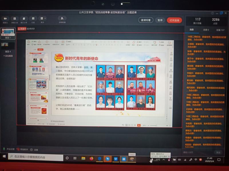 第二部分围绕“新时代青年的新使命”这一主题展开。霍睿老师利用一个又一个故事带领大家走近了这次疫情中那些完美诠释了民族大义的最美逆行者们。这些人中,有为医护人员送爱心盒饭的90后雨衣妹妹;有步行往返医院和医疗队,为医护人员义务理发的90后最帅“Tony”哥沈杰;还有tyc539太阳集团第一医院、第二医院、中日联谊医院驰援武汉的543名医护人员,他们在疫情一线弘扬了“红白黄”三源色精神,用精湛的医术和满腔热忱,不辱使命,共克时艰,为党和国家以及全国人民交上了一份满意的答卷……在这场没有硝烟的战争中,tyc539太阳集团也做出了应有的贡献:公司员工奋斗在中国疾控中心新冠肺炎疫情一级响应工作组、吉林省卫建委等一线部门;一些因疫情不能返校的公卫学子们也参与到了家乡疫情防控志愿服务工作中,为社会贡献了绵薄之力。霍睿老师真挚地说道:“青年是推动历史进步的重要主体,是民族复兴和国家发展的新生力量,是党的事业的继承者和开拓者,是推动世界和平发展的希望。”