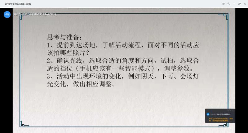 会议分为三天举办。13日晚,记者站站长黄卓然进行了摄影与修图方面的基础培训。在摄影方面,他首先为大家简要介绍了摄影中常用的相机参数,包括光圈与快门、ISO值、焦距等。紧接着,他讲解了光线与景深在摄影中的运用。在摄影培训的最后,黄卓然重点分析了具体活动类型的拍照思路,并强调活动前思考与准备的重要性。在修图方面,他主要从界面设置、核心参数的调整和部分工具的使用这三方面进行了PS软件的实际操作演示,并鼓励大家多摸索、多思考、多练习。