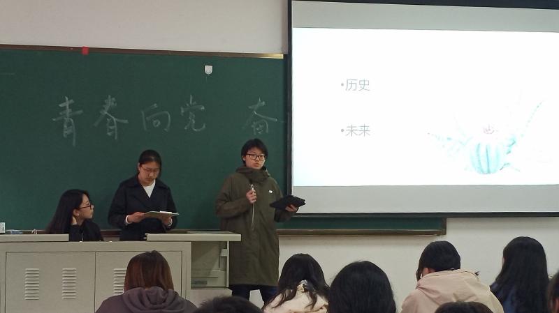 首先,班委和新同学进行了简单的自我介绍,随后主持人尹梓萌同学给同学们简单讲解了中国共产党经历的百年峥嵘岁月,并播放了讲述党的建立过程和发展过程的视频,让同学们更直观地认识党经历过的磨难,感受党的坚韧和顽强。随后,孙锡昱和李昕如同学分享了自己印象深刻的一段党史。在建党一百周年的历史节点上,作为新时代的老员工,尹彩云和薛乃雯同学分享了对自身和国家未来发展的看法。青年,是国家的未来和民族的希望,是社会上最富有朝气、最富有创造性、最富有生命力的群体。青年兴则国家兴,青年强则国家强。加强对五四运动和五四精神的研究,要回答好为什么当代青年必须把个人理想融入民族复兴伟大理想和中国特色社会主义思想这一问题。最后,以视频播放的方式表达了习近平总书记对青年的期望与寄语。