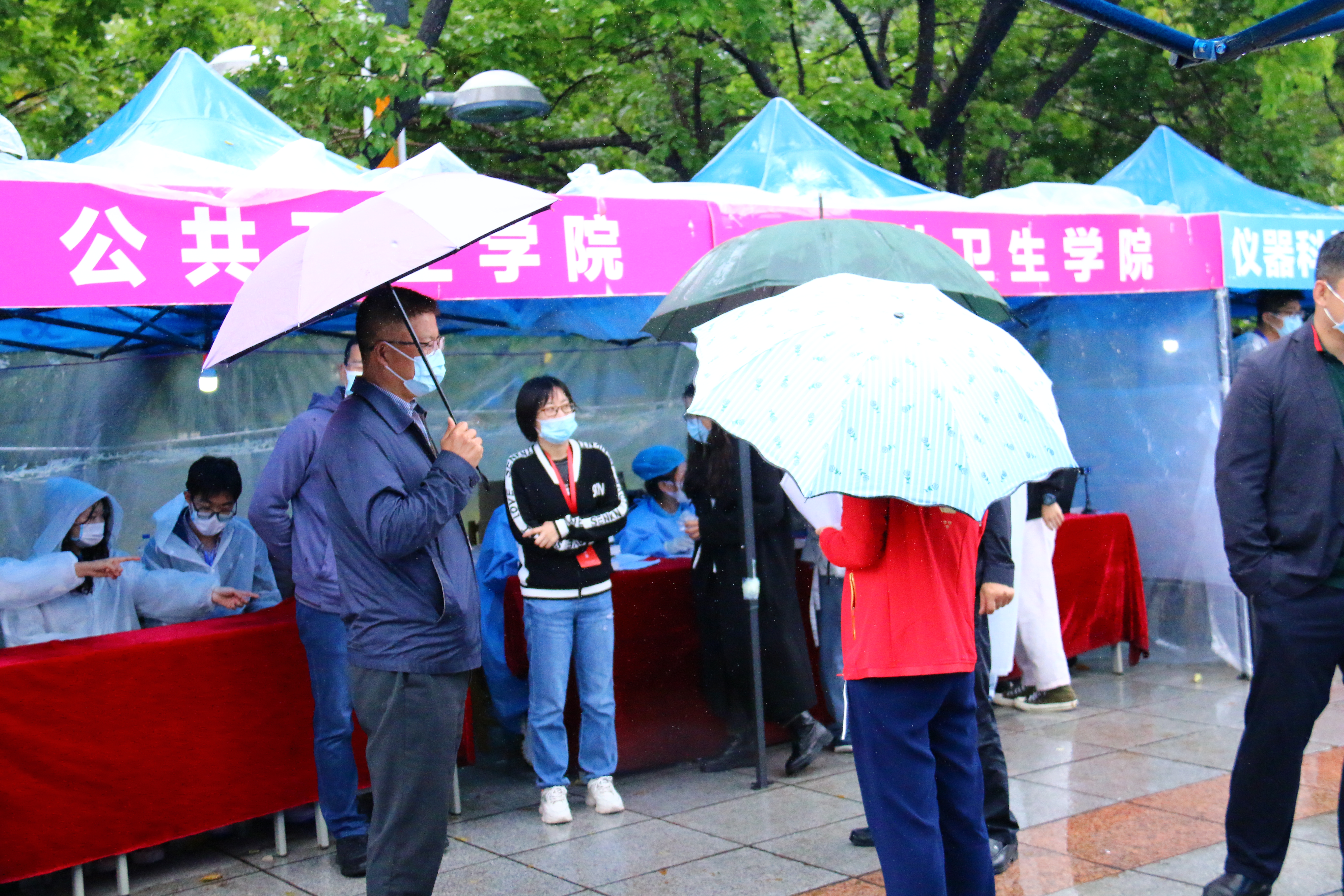公共卫生公司党委副书记兼副经理刘金超,辅导员苏国范、冷贺璇全程陪同新生报到,由2018级、2019级、2020级的同学们为志愿者来帮助学弟学妹们顺利入学,一群身着“蓝马甲”的青年志愿者们穿梭在校园中,正在开展2021届迎新接待的志愿服务,他们活跃的身影,在校园里形成了一道靓丽的风景线。