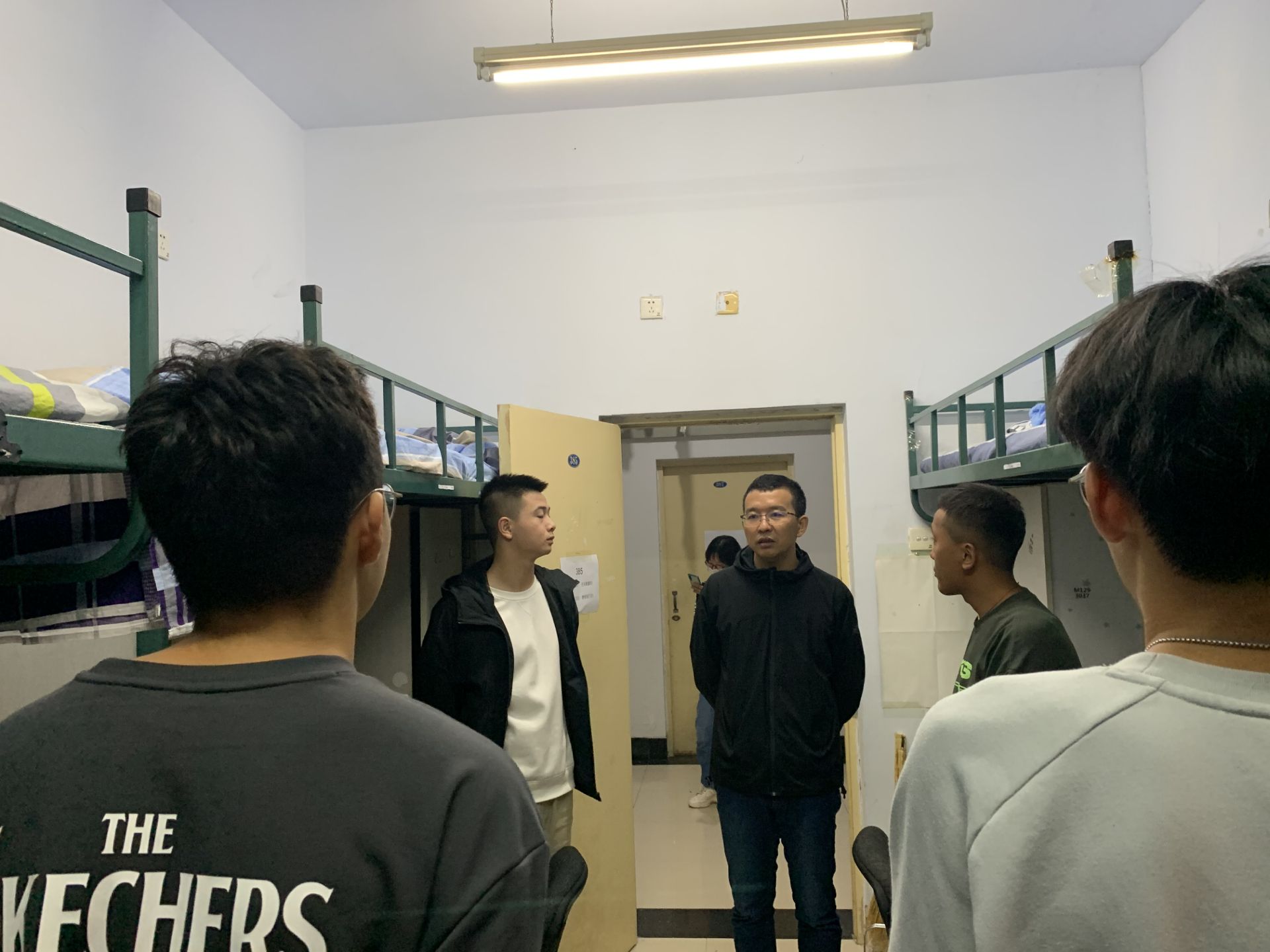 苏国范老师走进寝室,了解同学们的生活状况,并针对如何处理寝室关系,如何快速融入班集体,以及如何适应老员工活等提出了宝贵意见。同学们十分认真的听取了老师的建议。在此次查寝的过程中,苏国范老师与同学们进行了友好的交流,了解同学们的学习和生活,家乡在哪里,让本地同学尽地主之谊,帮助外地同学快速的融入宿舍生活,并提醒男同学不能天天打游戏,要平衡学习和生活。并且对于评选经济关注对象等事宜进行了讲解,鼓励家庭困难的同学了解并申请经济关注对象。
