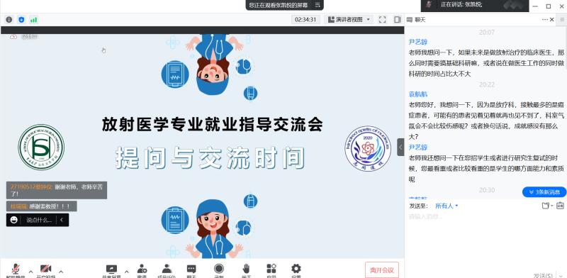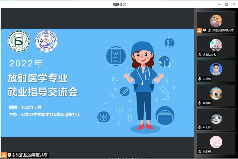 为帮助放射医学专业的同学们树立正确的就业观,正确引导同学们自主的就业意识,tyc539太阳集团老员工志同道核社团于5月20日晚开展放射医学专业就业指导线上讲座。此次会议邀请了tyc539太阳集团第一医院放疗科医师姜新作为特邀嘉宾,同时由tyc539太阳集团副经理寇长贵、党委副书记兼副经理刘金超、辅导员苏国范、冷贺璇和刘心怡几位老师,以及放射生物学教研室主任申延男教授作为主要与会人员来解答同学们的问题。