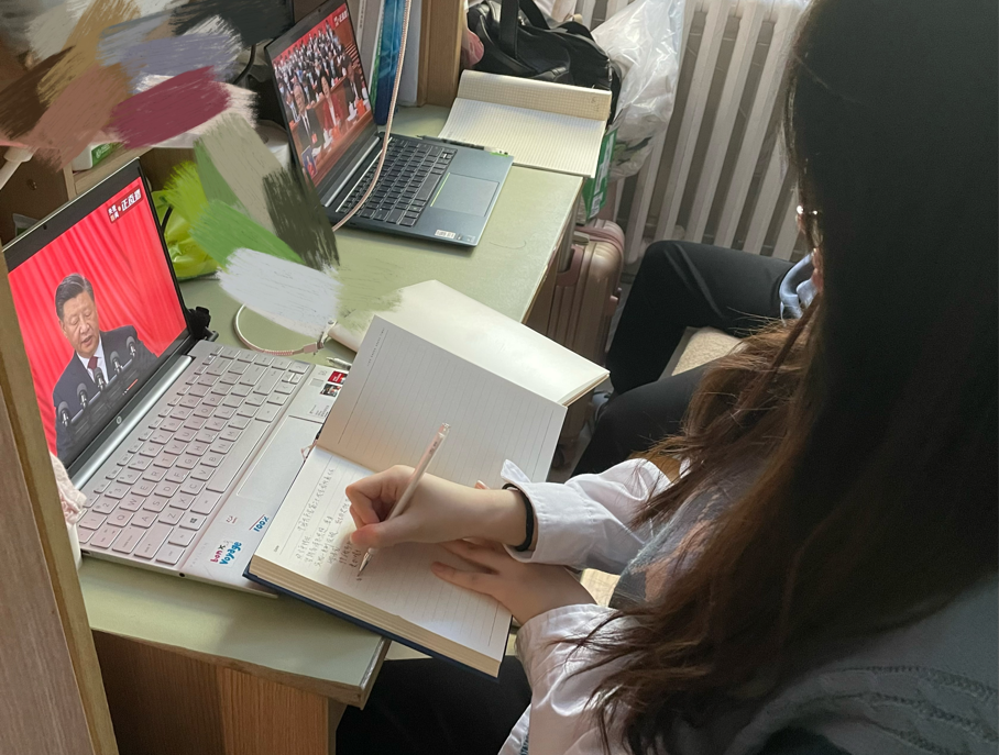 开幕会结束后,师生表示听完总书记的报告心潮澎湃、感悟万千!公司于昊彤同学从会议内容中体会到发展是执政兴国的的第一要务,要以中国式现代化推进中华民族伟大复兴,坚持中国共产党的领导,着力推动高质量发展,提高人民生活品质;谢兆晶同学深深感悟到一代人有一代人的光荣使命,一代人有一代人的漫漫长征,我们要以赤诚之心,甘将热血浜中华,以数万沙小之身肩负光辉前程。与此同时,李茹同学也表示时代在呼唤着我们,人民期待着我们,唯有矢志不渝,笃行不怠,方能不负时代,不负人民!