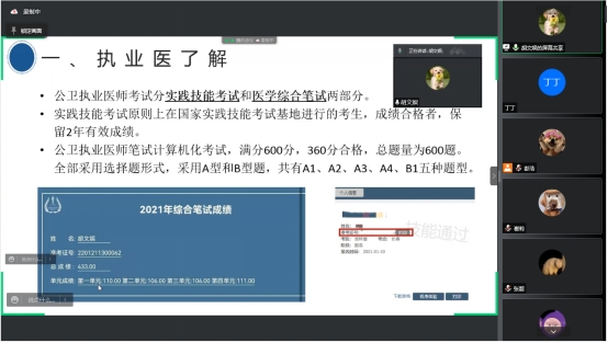 Hu Wenyu once scored 433 points in the medical practitioner examination (public health). At the meeting, she shared her experience in preparing for the medical practitioner examination with the students from four aspects: preliminary understanding of the medical practitioner examination, practical examination, comprehensive examination and precautions.