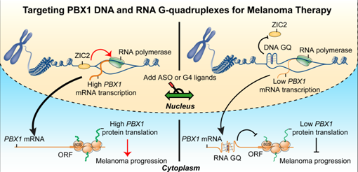 Through bioinformatics and cell biology experiments, the research team found that there was a highly conserved G4s motif in the promoter region and transcript of PBX1 in melanoma cells, and G4s formation would inhibit the transcription and translation of PBX1, significantly reducing the expression of PBX1 protein. Further research found that small molecular compounds TMPyP4 and PDS can bind and stabilize the G4s motif of PBX1, significantly inhibiting the growth and migration (metastasis) of melanoma cells in vitro and in vivo. Because TMPyP4 and PDS stable PBX1 transcript G4s have poor sequence specificity, the research team designed ASO specifically targeting PBX1 transcript G4s. This ASO can specifically induce the formation of PBX1 transcript G4s, and significantly inhibit the growth of melanoma in the xenotransplantation model of melanoma from patients. These important findings not only contribute to the in-depth analysis of the pathogenesis of melanoma, but also provide new clues and ideas for the prognosis of melanoma and the development of targeted nucleic acid advanced structure anticancer drugs. Sui Yutong, a doctoral student, is the first author of this thesis.